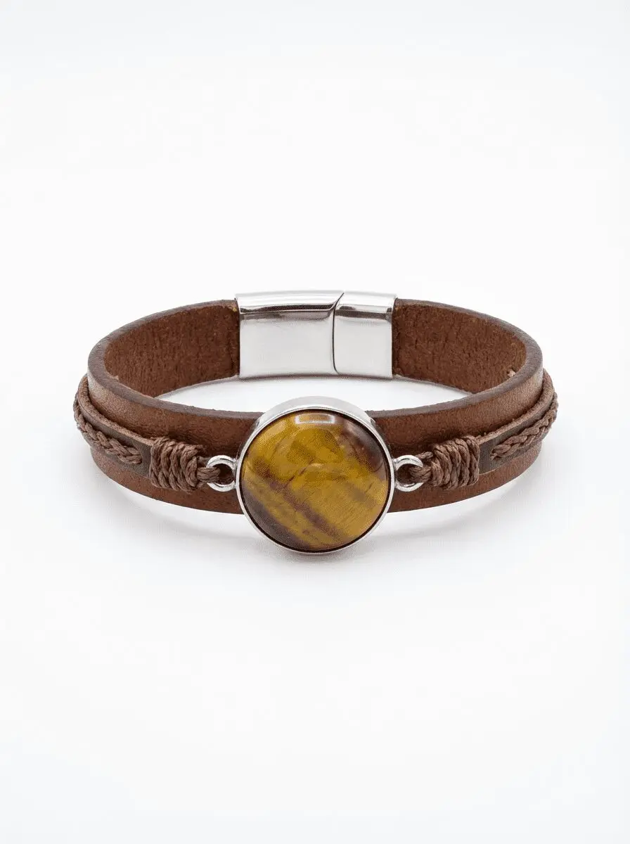 دستبند چشم ببر ژوو، ترکیبی بی‌نظیر از هنر دست و اصالت ایرانی. این دستبند با استفاده از سنگ چشم ببر (Tiger’s Eye) کاملاً طبیعی و اصل، نقره خالص عیار ۹۲۵ با آبکاری رادیوم و چرم گاوی درجه یک ساخته شده است.